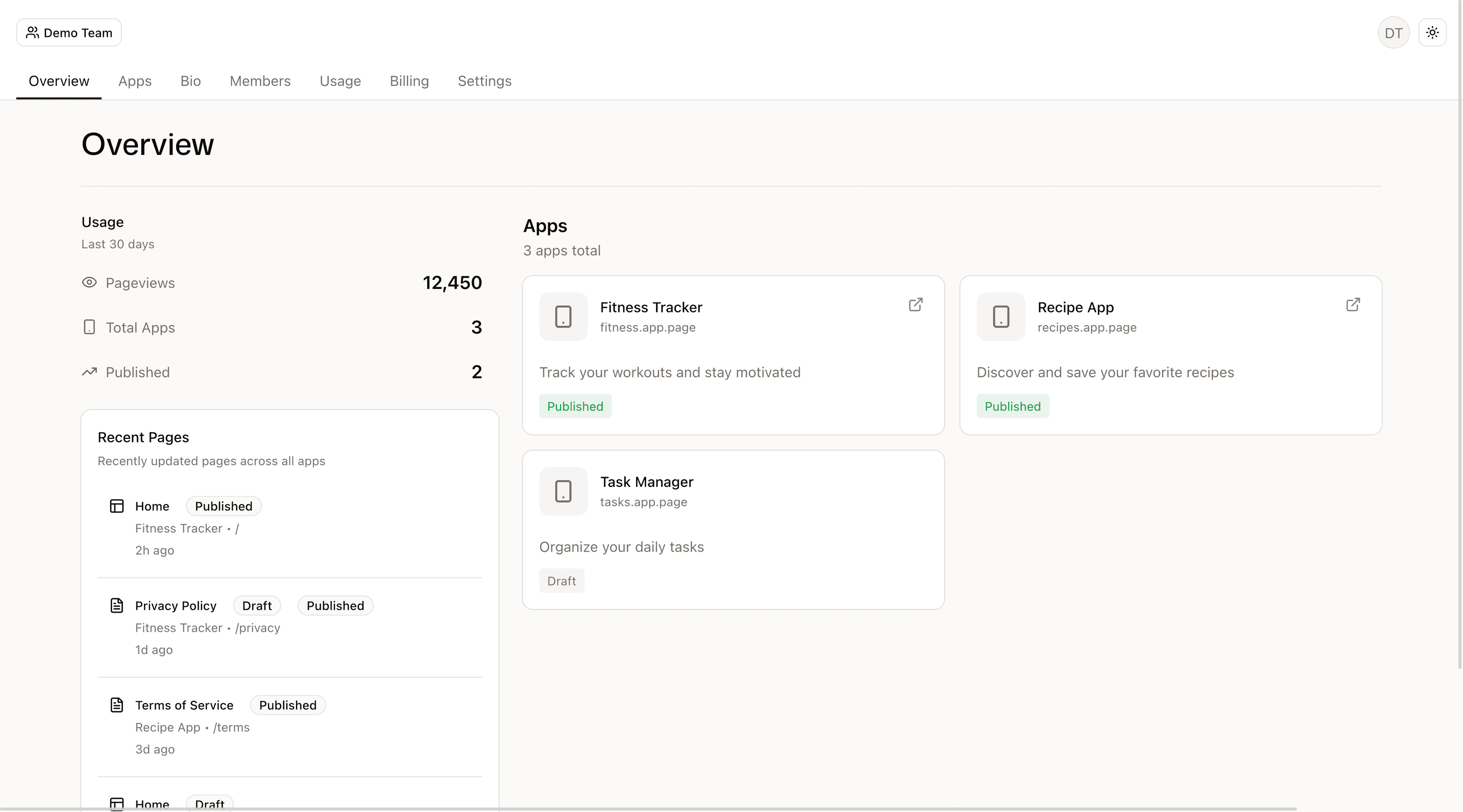 From legal pages that unblock App Store approval to landing pages that showcase your app. All hosted automatically at yourapp.app.page. Zero web dev. Zero hosting setup.